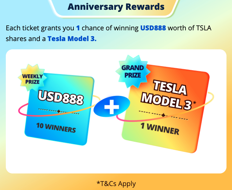 Each ticket grants the user 1 chance of winning USD888 worth of TSLA shares, as well as a chance to win the Grand Prize of a Tesla Model 3 car!